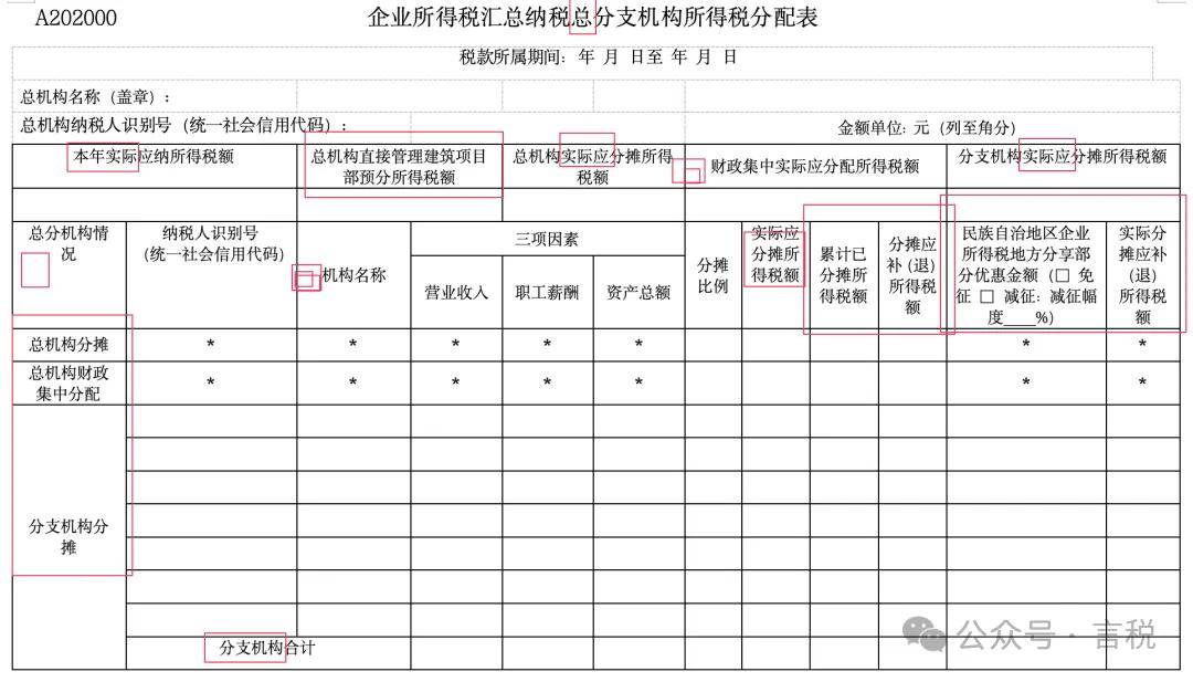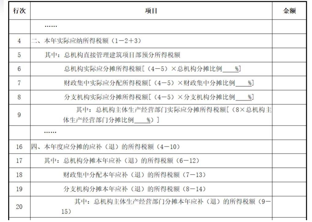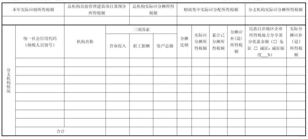 2.基于计算方法调整的需要,在行次上增加“总机构分摊”“总机构财政集中分配”等项目,在列次上增加“实际应分摊所得税额”“累计已分摊所得税额”“分摊应补(退)所得税额”等项目。