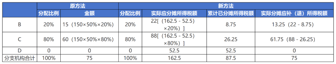 第一季度预缴申报时,B、C、D分支机构均参与分配,按照10%、40%、50%分配比例计算,具体如下: