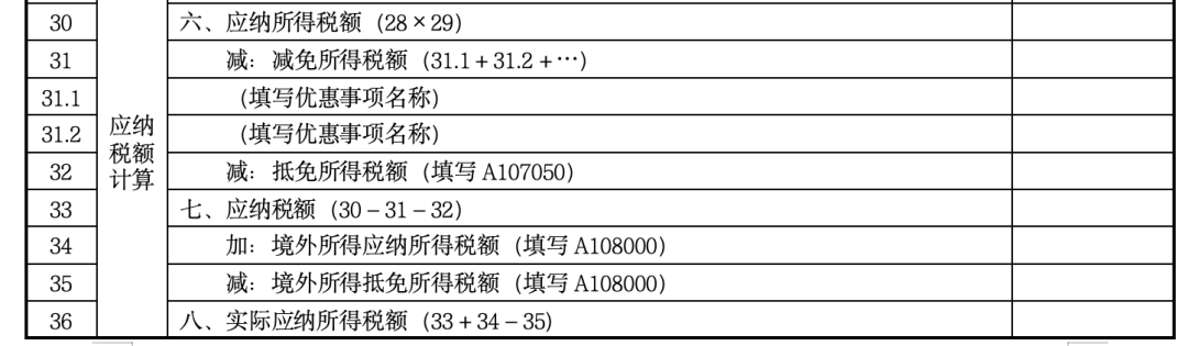 第31行“减免所得税额”:根据相关行次计算结果填报纳税人按税收规定实际减免的企业所得税额。纳税人根据《企业所得税申报事项目录》,在第31.1行、第31.2行……填报税收规定的减免所得税额优惠事项的具体名称和本年累计金额。发生多项且根据税收规定可以同时享受的优惠事项,可以增加行次,但每个事项仅能填报一次。具备高新技术企业资格的纳税人和享受软件、集成电路企业优惠政策的纳税人,同时在《高新技术企业优惠情况及明细表》(A107041)和《软件、集成电路企业优惠情况及明细表》(A107042)中填报具体情况。