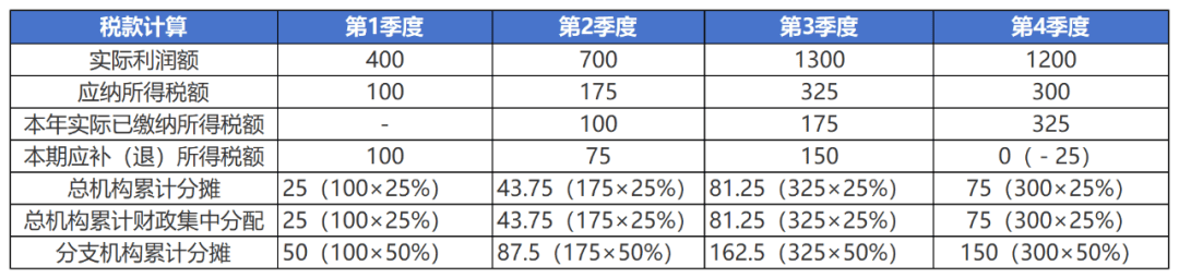 A公司2025年第一季度实际利润额400万元,第二季度累计实际利润额700万元,第三季度累计实际利润额1300万元,第四季度累计实际利润额1200万元,不享受企业所得税相关优惠政策。A公司各季度税款和分摊情况如下: