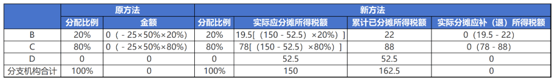 第三季度预缴申报时,由于D分支机构已经注销,其不再参与分配,已经缴纳的税款也不再重新分配,B、C分支机构按照20%、80%的分配比例计算,具体如下: