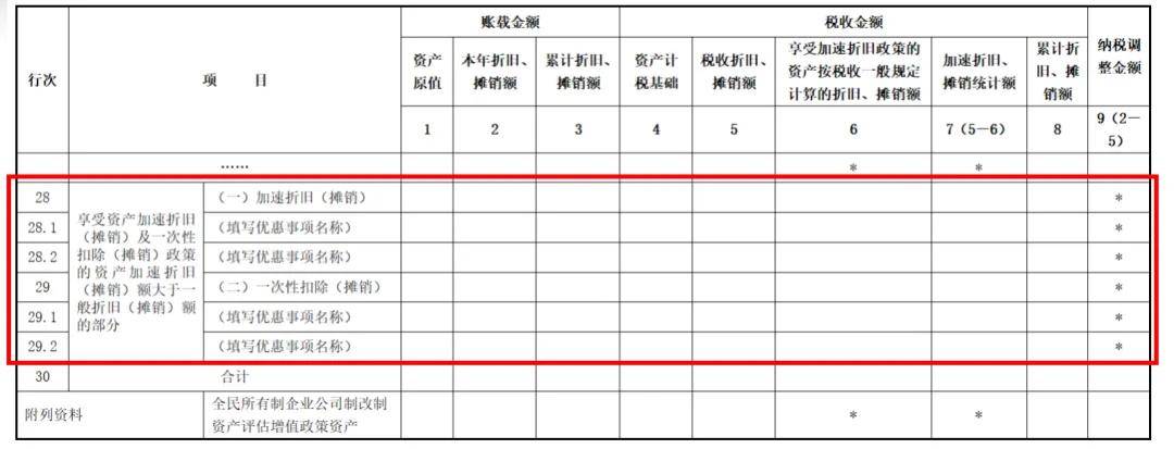 参照主表优惠事项填报方式,对《资产折旧、摊销及纳税调整明细表》(A105080)进行调整,将表单中涉及固定资产和无形资产加速折旧或摊销的优惠项目整合到5080表第28行至第29行填报,纳税人可根据《企业所得税申报事项目录》选择填报。享受资产加速折旧(摊销)及一次性扣除(摊销)政策的资产加速折旧(摊销)额大于一般折旧(摊销)额的部分:加速折旧(摊销)、“一次性扣除(摊销)”