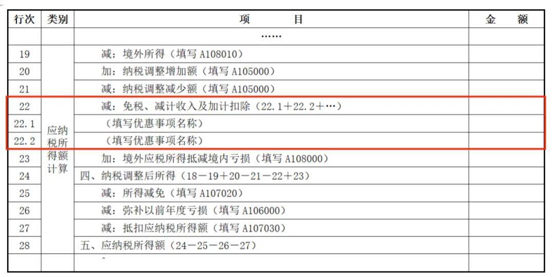 第22行“免税、减计收入及加计扣除”:根据相关行次计算结果填报属于税收规定的免税收入、减计收入、加计扣除金额。纳税人根据《企业所得税申报事项目录》,在第22.1行、第22.2行……填报税收规定的免税收入、减计收入、加计扣除等优惠事项的具体名称和本年累计金额。