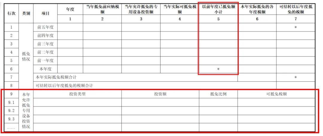 根据《财政部 税务总局关于节能节水、环境保护、安全生产专用设备数字化智能化改造企业所得税政策的公告》(2024年第9号)规定,将原《税额抵免优惠明细表》(A107050)中“专用设备投资情况填报信息”固定行次变更为可增加的明细行次,同时增加“投资类型”、“投资额”、“抵免比例”、“可抵免税额”等填报项目,满足新政策填报需要。