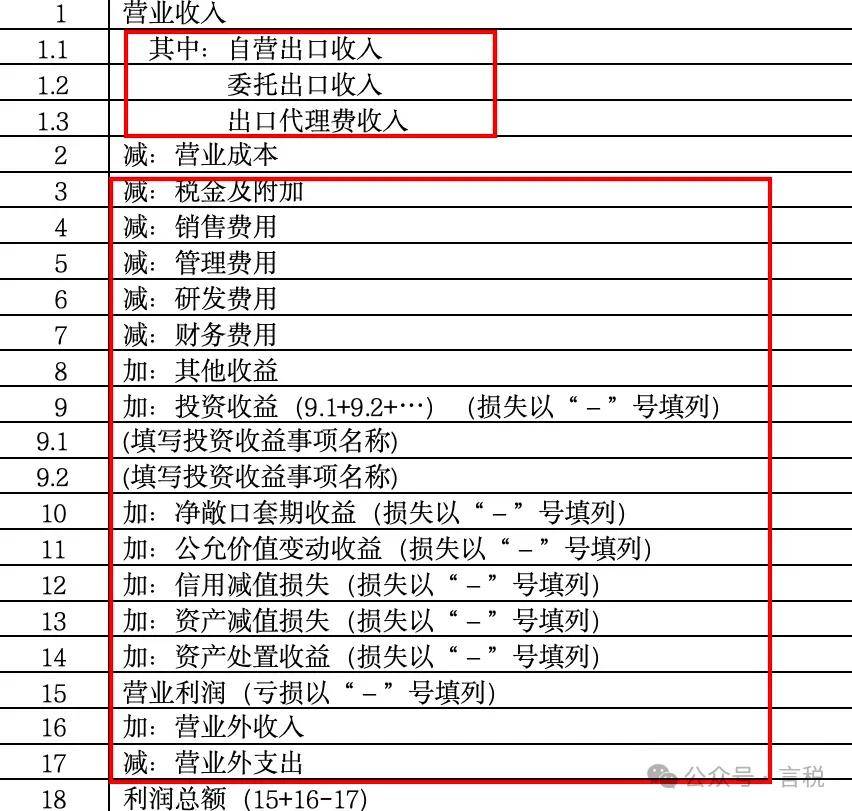 (2)调整行次设置。“利润总额计算”部分,按照国家统一会计制度规定计算填报。结合新收入准则、租赁准则、金融工具和金融资产相关准则,根据最新财务报表样式优化调整“利润总额计算”相关行次。——“减:研发费用”“加:其他收益”“加:净敞口套期收益”“加:信用减值损失”“加:资产减值损失”“加:资产处置损失”。