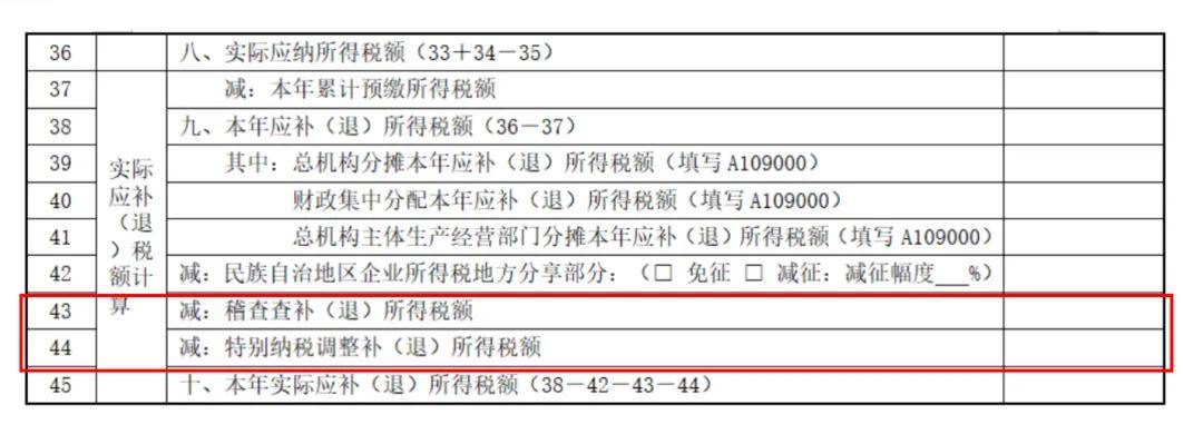 第44行“特别纳税调整补(退)所得税额”:填报年度汇算清缴期结束后发生的税款所属期为本年度的特别纳税调整实际已补(退)所得税额。