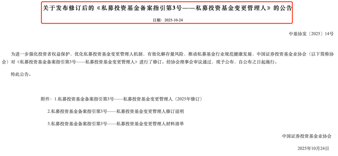 关于《备案指引3号》发布的背景,协会提到,随着近年私募基金行业的快速发展,私募基金管理人优胜劣汰加速,部分机构“失联”“失能”等问题引发基金治理及清算难题,制约行业高质量发展。