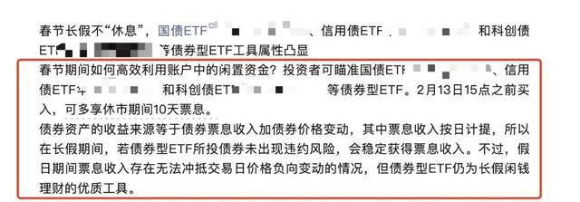 不少宣传文章就指出,国债ETF、信用债ETF、科创债ETF在春节期间闲钱理财属性明显,2月13日15点之前买入,可多享休市期间10天票息,有稳定的票息收入等。