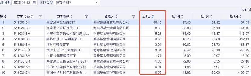 从资金变动来看,在2月12日,海富通短融ETF、海富通城投债ETF、平安公司债ETF、鹏扬30年国债ETF、博时可转债ETF、博时30年期国债ETF、国泰10年期国债ETF均有明显的资金流入。