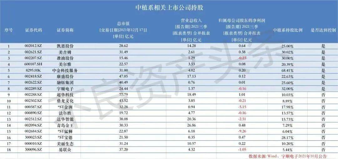 根据中植集团网介绍,截至目前,其控股8家上市公司,包括*ST天山、凯恩股份、准油股、宇顺电子、康盛股份、美吉姆、融钰集团、美尔雅。但据媒体报道,其参股的上市公司一共有33家。
