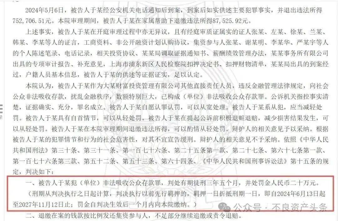 此外,2025年年11月,作为“中植系”旗下核心财富管理平台之一,大唐财富上海第一分公司总经理、省级区域总经理的一审判决结果公示:被告人于某犯(单位)非法吸收公众存款罪,判处有期徒刑三年五个月,并处罚金人民币二十万元。